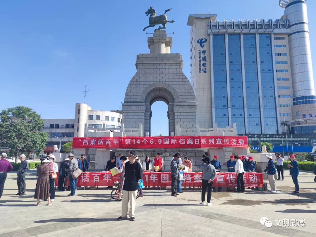 活动通过悬挂宣传标语、发放档案宣传资料等形式向广大群众宣传档案工作,普及档案知识以及档案法律法规,向群众深入讲解武威革命历史,现场共发放《中华人民共和国档案法》宣传彩页、宣传资料3000余份,赠送家庭档案盒100个、档案宣传品400个,概览展板14块,展出主题宣传展板20块。